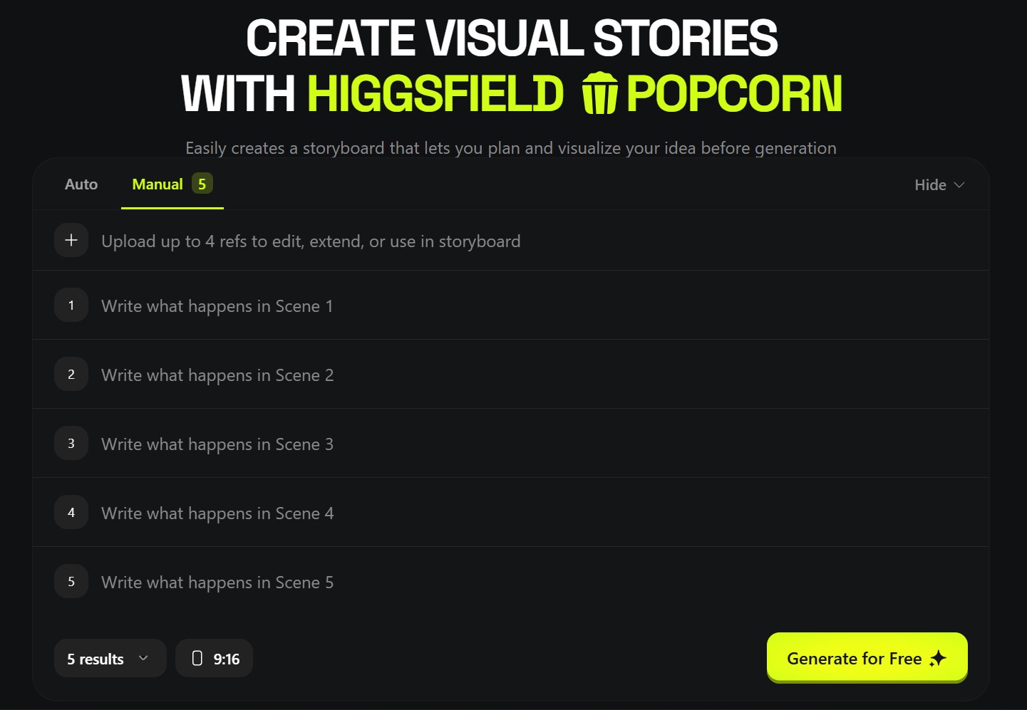 - Choose either Manual mode (where I write out exact scenes after you upload the images) or Auto mode (where you describe the mood/action and Popcorn runs the rest).