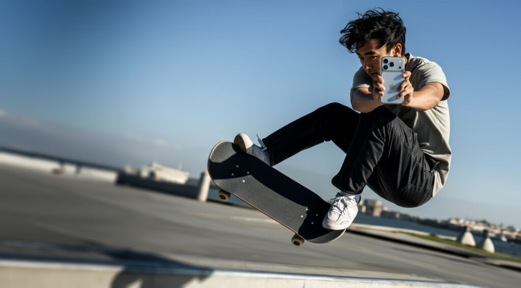 Image Reference: The skateboarder mid-air holding the iPhone.